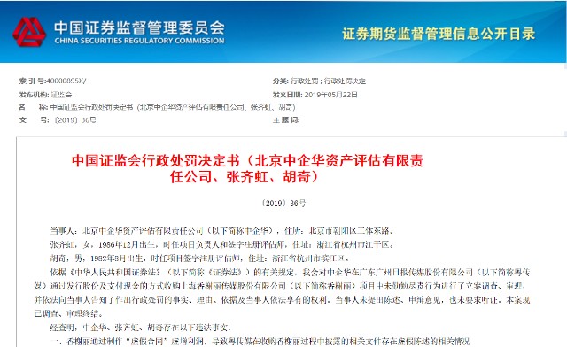 在2019年,北京中企华资产评估有限责任公司有被证监会查出在对香榭丽这家公司进行资产评估时存在严重造假!中企华通过协助香榭丽制作“虚假合同”来虚增利润,导致粤传媒在收购香榭丽过程中披露的相关文件存在虚假陈述!中企华的违规还体现在对香榭丽应收账款执行函证程序时未保持有效控制,对作为评估基础的香榭丽历史财务数据评估程序不到位,未对采用其他证券服务机构的专业意见的内容审慎核查等。