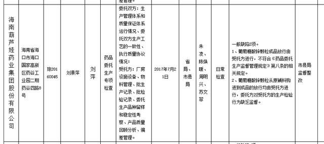 其次,在2017年7-8月药品生产监督检查情况通报中,葫芦娃药业还是榜上有名!2017年7-8月,海南省局、各有关市县食药监局组织检查人员对辖区内的药品生产企业进行跟踪检查、飞行检查、日常检查、专项检查等。此次检查发现葫芦娃药业存在一般缺陷2项。一是,葡萄糖酸锌颗粒成品放行由受托方进行,不符合《药品委托生产监督管理规定》第八条的相关规定。其次是葡萄糖酸锌颗粒从原辅料购进到成品的放行均由受托方进行,委托方对受托方的生产检验行为缺乏监督。这一次的检查结果虽然没有严重违规,但是和葫芦娃药业在招股书中的宣传却是天壤之别!
